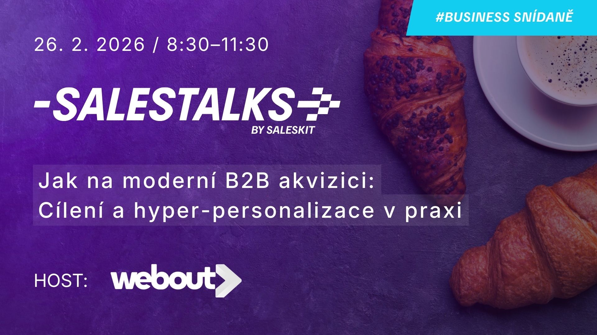 Zveme vás na inspirativní byznys snídani SalesTalks od Saleskitu, kde se spolu s Webout podíváme na to, jak vypadá moderní B2B akvizice v praxi – od definice ideálního trhu, přes hyper-personalizovaný marketing, až po perfektní přípravu na obchodní schůzku.
